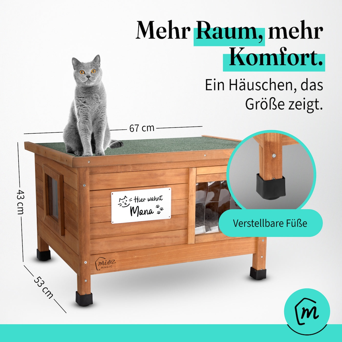 Das Miez Magic Outdoor Katzenhaus vereint alle Annehmlichkeiten für Deine Freigänger-Katze. Kein nachträgliches Basteln oder Aufmöbeln wie bei anderen Modellen notwendig. Wir haben an alles gedacht, was Deine geliebte Katze zum Wohlfühlen braucht.