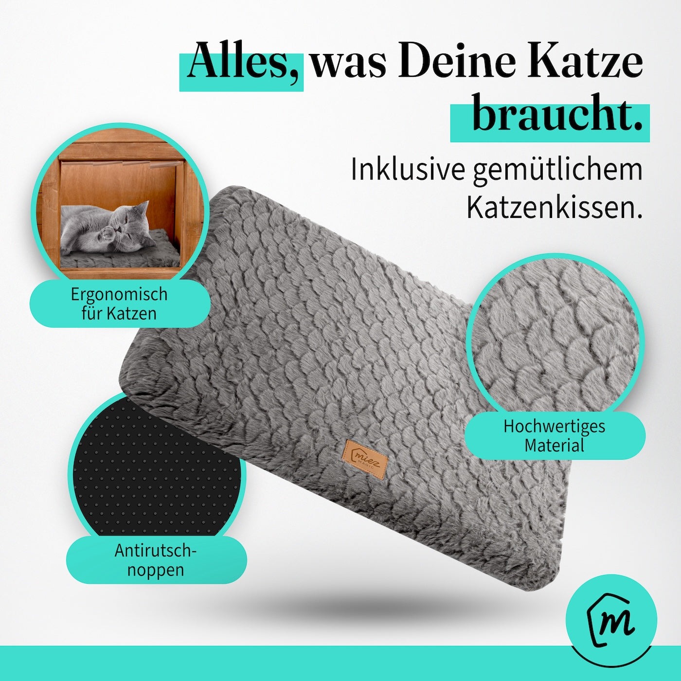 - Lade Deine Katze zum Träumen und Wohlfühlen ein: Hergestellt aus hochwertigem Fichtenholz und ausgestattet mit einem kuscheligen Kissen, bietet es die perfekte Wohlfühloase.