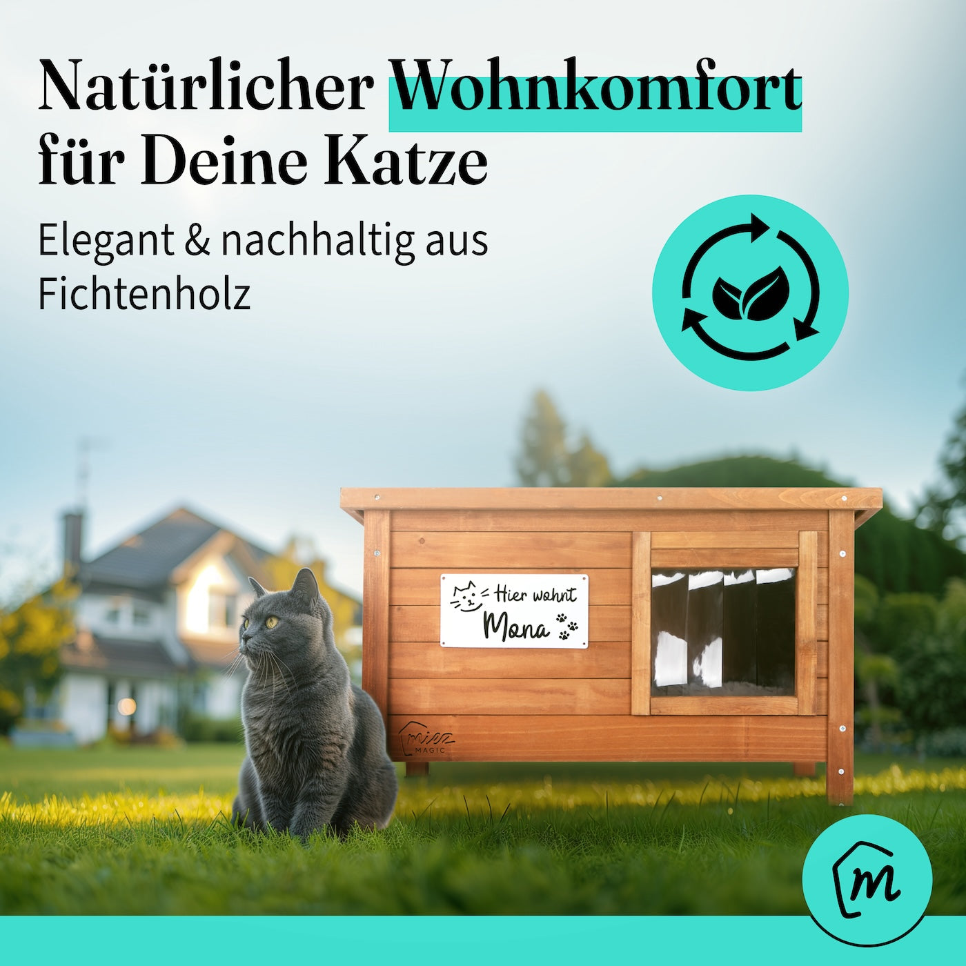Was ist ein Haus ohne Türschild? Mit dem PVC-Schild im Lieferumfang, verleihst Du dem Katzenhaus eine persönliche Note.