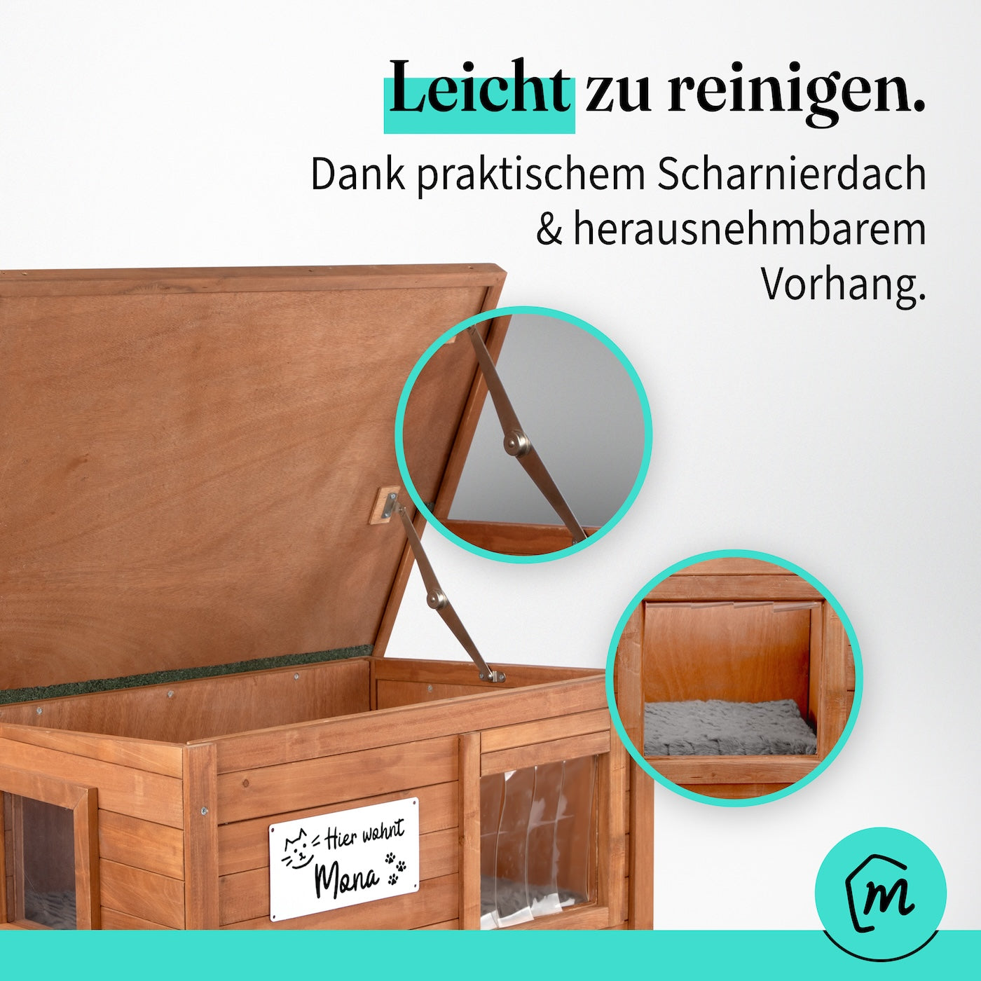 Zimmerservice gefällig? Durch die leicht zu öffnende Dach ist die Reinigung des Katzenhauses ein Kinderspiel. Außerdem erleichtert der abnehmbare Thermovorhang die Eingewöhnung Deiner Katze.