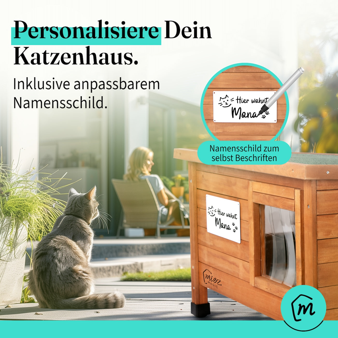 Jedem Katzenhaus liegt ein Hausschild bei, welches personalisiert werden kann. Somit verleihst Du dem neuen Katzenhaus eine persönliche Note.